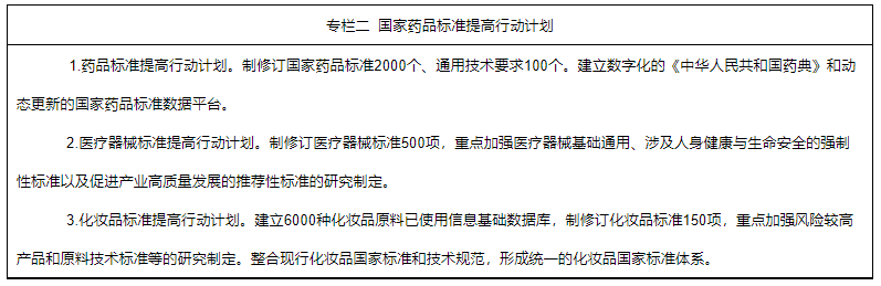 1.持續(xù)推進(jìn)標(biāo)準(zhǔn)體系建設(shè)。繼續(xù)開(kāi)展國(guó)家藥品標(biāo)準(zhǔn)提高行動(dòng)計(jì)劃。編制2025年版《中華人民共和國(guó)藥典》。加強(qiáng)標(biāo)準(zhǔn)的國(guó)際協(xié)調(diào),牽頭中藥國(guó)際標(biāo)準(zhǔn)制定,化學(xué)藥品標(biāo)準(zhǔn)達(dá)到國(guó)際先進(jìn)水平,生物制品標(biāo)準(zhǔn)與國(guó)際水平保持同步,藥用輔料和藥包材標(biāo)準(zhǔn)緊跟國(guó)際標(biāo)準(zhǔn)。加強(qiáng)藥品標(biāo)準(zhǔn)技術(shù)支撐體系建設(shè),提升藥品標(biāo)準(zhǔn)研究能力。優(yōu)化醫(yī)療器械標(biāo)準(zhǔn)體系,鼓勵(lì)新興技術(shù)領(lǐng)域推薦性標(biāo)準(zhǔn)制定,加快與國(guó)際標(biāo)準(zhǔn)同步立項(xiàng),提升國(guó)內(nèi)外標(biāo)準(zhǔn)一致性。完善化妝品標(biāo)準(zhǔn)技術(shù)支撐體系,健全標(biāo)準(zhǔn)制修訂工作機(jī)制。