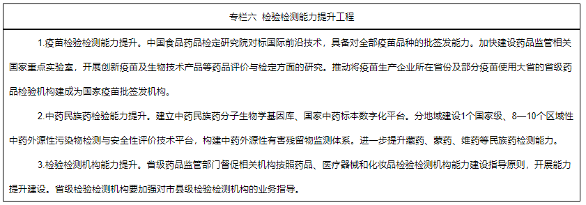 5.加強(qiáng)檢驗(yàn)檢測(cè)體系建設(shè)。加強(qiáng)藥品、醫(yī)療器械檢驗(yàn)檢測(cè)關(guān)鍵技術(shù)和平臺(tái)建設(shè)。以中國(guó)食品藥品檢定研究院為龍頭、國(guó)家藥監(jiān)局重點(diǎn)實(shí)驗(yàn)室為骨干、省級(jí)檢驗(yàn)檢測(cè)機(jī)構(gòu)為依托,完善科學(xué)權(quán)威的藥品、醫(yī)療器械和化妝品檢驗(yàn)檢測(cè)體系。國(guó)家級(jí)檢驗(yàn)機(jī)構(gòu)著重瞄準(zhǔn)國(guó)際技術(shù)前沿,強(qiáng)化重點(diǎn)專業(yè)領(lǐng)域檢驗(yàn)?zāi)芰ㄔO(shè)。地方各級(jí)檢驗(yàn)機(jī)構(gòu)針對(duì)日常和應(yīng)急檢驗(yàn)需求,補(bǔ)齊能力短板,力爭(zhēng)具備應(yīng)對(duì)突發(fā)公共衛(wèi)生事件“應(yīng)檢盡檢”能力。圍繞藥品關(guān)聯(lián)審評(píng)審批及監(jiān)管需要,推動(dòng)建立布局合理、重點(diǎn)突出的藥用輔料和藥包材檢驗(yàn)檢測(cè)體系。