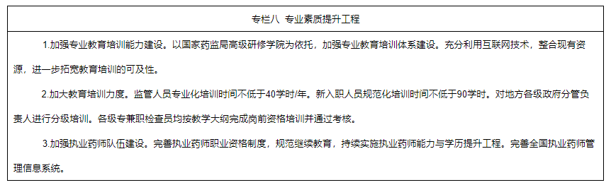 5.全面提升監(jiān)管隊(duì)伍專業(yè)素質(zhì)。實(shí)施專業(yè)素質(zhì)提升工程,大力開(kāi)展專業(yè)能力教育培訓(xùn),有計(jì)劃地開(kāi)展各級(jí)負(fù)責(zé)藥品監(jiān)管的部門(mén)負(fù)責(zé)人領(lǐng)導(dǎo)能力培訓(xùn)。加強(qiáng)全國(guó)藥品監(jiān)管隊(duì)伍專業(yè)化建設(shè),嚴(yán)把入口關(guān),穩(wěn)步提升監(jiān)管隊(duì)伍專業(yè)化水平。