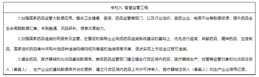 1.建立健全藥品信息化追溯體系。落實(shí)藥品上市許可持有人追溯主體責(zé)任。完善藥品信息化追溯體系,構(gòu)建國(guó)家藥品追溯協(xié)同服務(wù)和監(jiān)管體系,推進(jìn)藥品追溯信息互通共享,實(shí)現(xiàn)重點(diǎn)類別藥品全過(guò)程來(lái)源可溯、去向可追。逐步實(shí)施醫(yī)療器械唯一標(biāo)識(shí),完善醫(yī)療器械唯一標(biāo)識(shí)數(shù)據(jù)庫(kù),加強(qiáng)在上市后監(jiān)管、醫(yī)療管理、醫(yī)保管理等領(lǐng)域的銜接應(yīng)用。