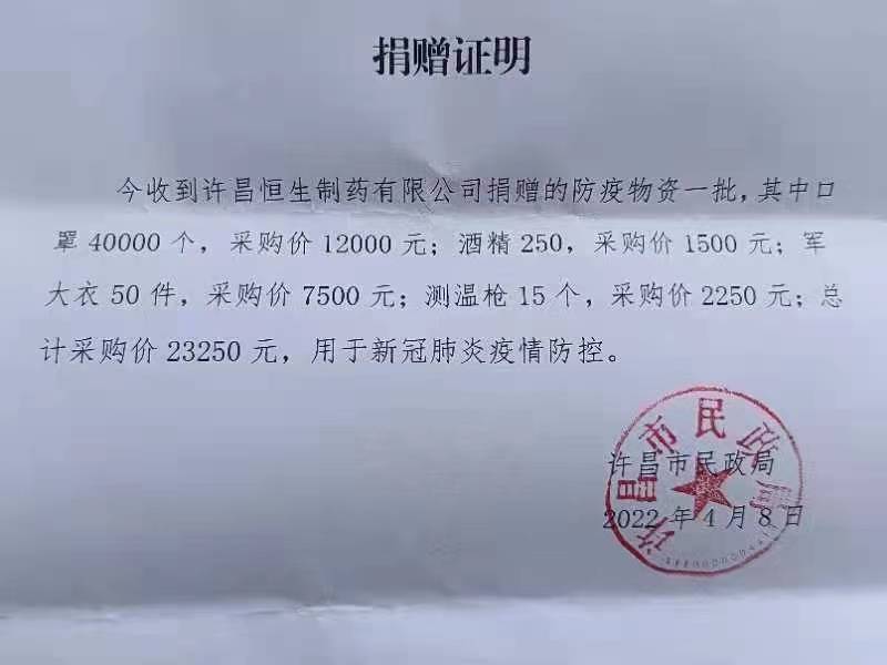 2022年04月08日許昌恒生制藥有限公司向許昌市民政局捐贈物資助力疫情防控,為疫情防控盡一點綿薄之力。